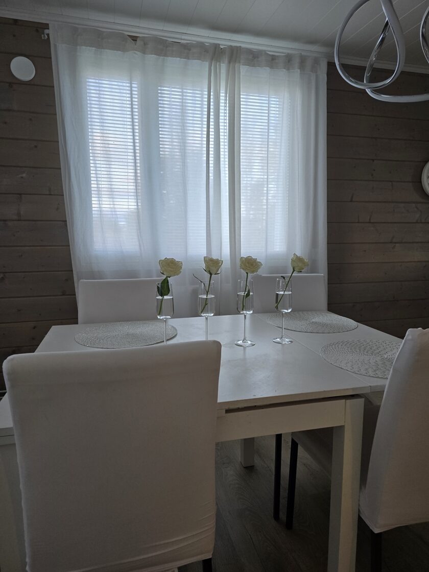 Sisällä alakerrassa on esim. mun pojan huone, telkkuhuone, kodinhoitohuone, pesutilat, ruokasali ja keittiö. Yläkerrassa tein yhdestä huoneesta vaatehuoneen. Kaikki vielä kesken. Haluisin ruokasaliin sit joskus oikein suuren pöydän.